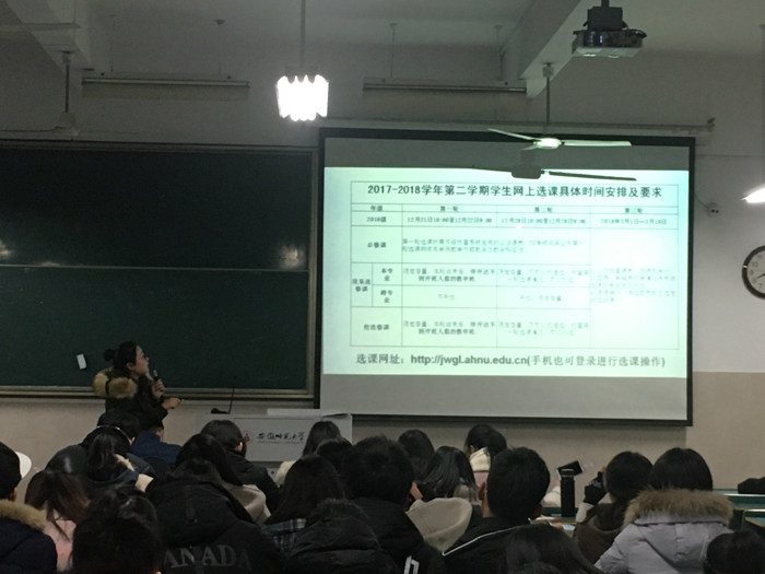 年终带来的不仅是各门课程的测评,同时下学期的选修课也随之来临,张雁就如何选、何时选、选何课作了具体分析,希望大家根据2016年版人才培养方案与课程学分的衡量来确定最终选择,使来年的目标更加明晰。(文/钱帆帆 图/骆梦茹)
