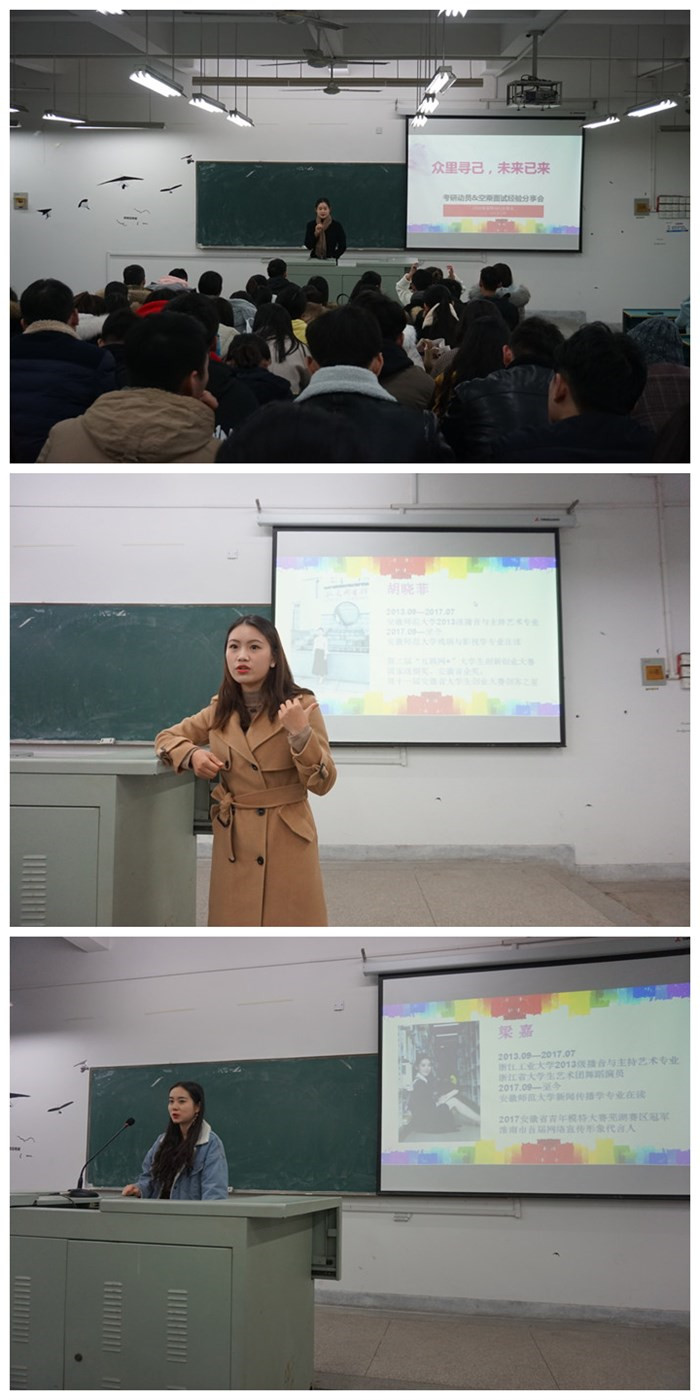 近日,2015级空乘专业召开了以“众里寻己,未来已来”为主题的考研就业动员会,来自学院2017级新闻传播学和戏剧与影视学专业保研、考研成功的三位学姐分享了自己的考研经验和就业心得,会议由辅导员老师余梦雅主持,15级空乘专业全体同学参加。