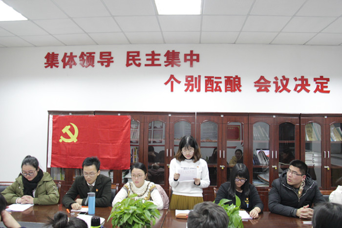 随后,党支部召开了党的十九大精神专题学习讨论会。中国共产党第十九次全国代表大会,是在全面建成小康社会决胜阶段、中国特色社会主义进入新时代的关键时期召开的一次十分重要的大会。领学人李婷认为大会的主题回答了今后中国将举什么旗?走什么路?有什么目标?这几个问题的回答,也预示着中国特色社会主义进入新时代,而新时代主要体现在形成新理论、引领新使命、迈开新征程、提出新矛盾和开启新党建四个方面。作为学生党员,李婷认为身处新时代我们在理论上要长期不断加强党政策方针的学习,紧跟党的最新理论成果,坚持用科学理论武装头脑,坚定理想信念,提高自身党性觉悟。在实践上要尽好本职,履行党员义务,身先垂范,以个人小梦的实现助推伟大中国梦的实现。在思想上要做合格党员,要笃信有忠。支部其他党员也结合十九大精神学习体会和日常生活、学习经历发表了自己的看法。