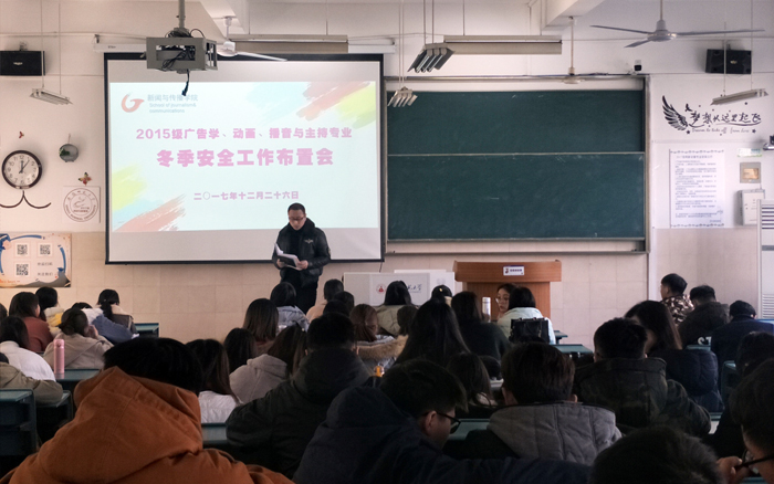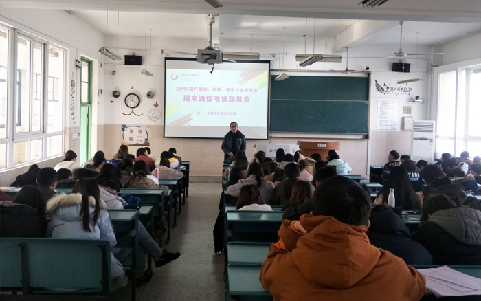 12月26日中午,德赢AC米兰合作伙伴2015广告学、播音与主持艺术、动画专业在2050302教室召开冬季安全工作布置会及期末诚信考试动员会,会议由辅导员老师孙文主持。