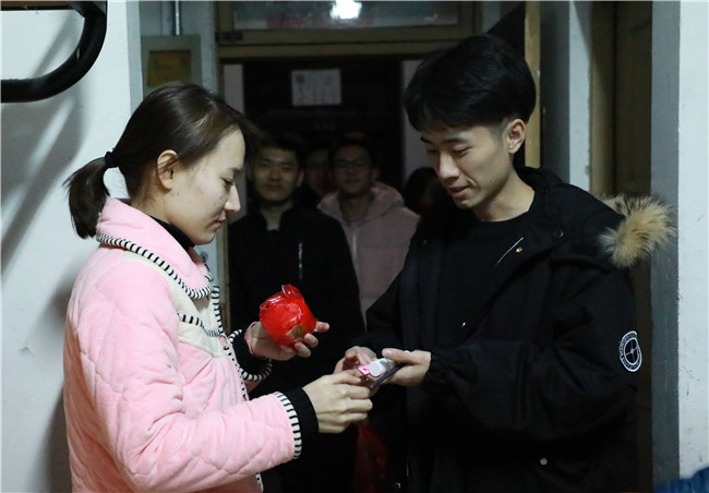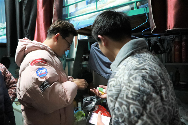 活动中,马星宇、苗迪、蔡鹤、张书朋、王伟等党员来到每一间寝室,为同学们送上了实用的文具和寓意“心想事成”的脐橙,提醒他们正常发挥,取得好的成绩。支委班子一行还顺便查看了寝室安全卫生情况。