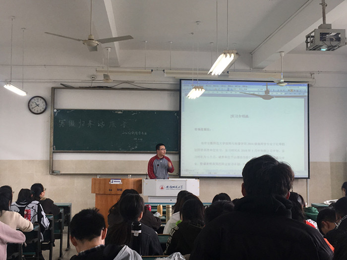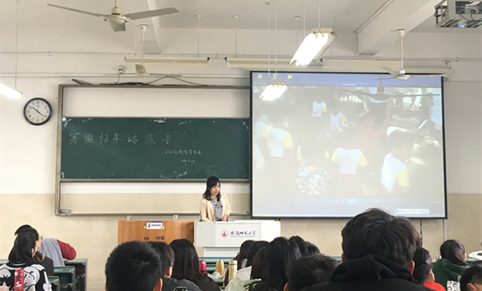 徐晨讲述利用寒假前往斯里兰卡做国际义工,她的经历着实让大家感慨了一番,播映在PPT上的一张张幼稚的笑脸、美如画的风景一刻不停地向大家展示着这项工作的魅力,自发寻找途径的勇气、离家千万里的魄力、异国友人的亲和都是她的收获;实习也搬上了大屏幕,丁纪利用一个月的时间在星报集团的新媒体部好好抓了一把业务操作,“我觉得那里的人都十分厉害,微信推送做得真的很快,我也感到压力催人。”丁纪笑称,ps技术的重要性让他在做着一张张海报中悟到,“本事在身上,谁也抢不走。”