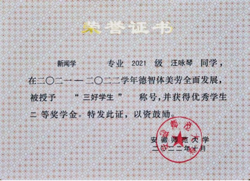 高三时期,汪咏琴的心里就埋下了新闻的种子。无论是高考填报志愿,还是大二专业分流时,她都义无反顾地将新闻学放在了第一选择位上。“细腻的调查里又有一种人文关怀,让我觉得把它作为一种人生的理想去追求的话,会是一件很有意义的事情。”在之后的专业学习中,汪咏琴也保持着对于新闻专业的热爱,连续三年获得校级奖学金。
