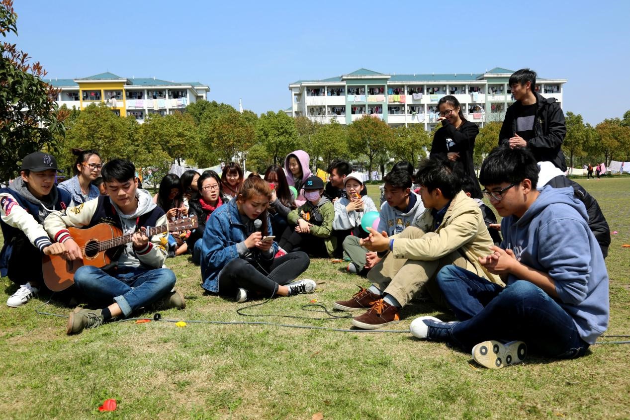 不仅仅只是有赛事,活动最后还有班级同学的才艺展示。同学们坐在草坪上,享受温暖的阳光,吃着零食,听着班级女生带来的歌曲和男生的吉他伴奏。整个操场都萦绕着同学们的欢声笑语。