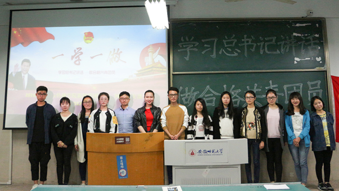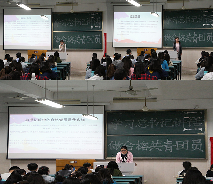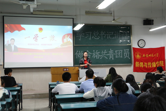 “我志愿加入中国共产主义青年团,坚决拥护中国共产党的领导,遵守团的章程,执行团的决议……”当这段熟捻于心的入团誓词悠悠被颂出时,2016级新闻与网新团支部的学生内心是激情澎湃的。这是2017年4月14日的晚上,浮云卷霭,明月流光,16级新闻与网新团支部于2040403教室开展以“学习习近平讲话,做合格共青团员”为主题的学习会,本次学习会在辅导员张雁的指导下,由田晓怡、徐晨主持,旨在强化团员的先进性和光荣感,坚定共产主义远大理想和中国特色社会主义共同理想。
