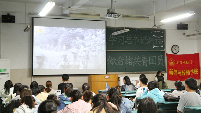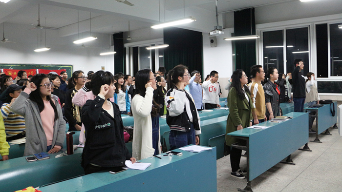 随着时间的流逝,屏幕上的内容已悄然翻到了入团誓言这一页。全体起立,由16新闻2班的班长曹寅飞领读,同学们跟读。那雄厚的嗓音像是要把一腔豪情显出,那大声的朗读映着同学们的自豪与激情,那一张张面孔带着对团、对党的信任,这一时刻,永远地被定格在了相框里。此后,由徐晨、田晓怡带领大家复习团章团规,使同学们接受严格规范的组织生活锻炼,增强团员意识,强化组织意识和组织纪律,更好地听党话、跟党走,更加自觉地向党中央看齐。
