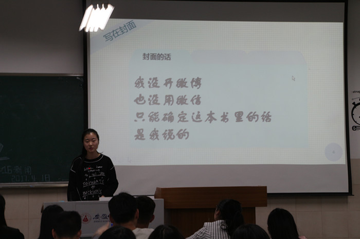 美国天文学家惠普尔说过:“书籍是屹立在时间的汪洋大海中的灯塔”书籍之如灯塔,将前人的智慧光芒送到我们身边,指引着我们学习的方向。4月18日晚,2016级新闻学专业的同学组织了一场读书汇报会,将思想与文化的碰撞带到同学身边。此次活动邀请了学院学习部副部长卜梦男,读者协会副会长丁佳洁,马克思主义新闻观学习社社长江志航作为嘉宾评委。