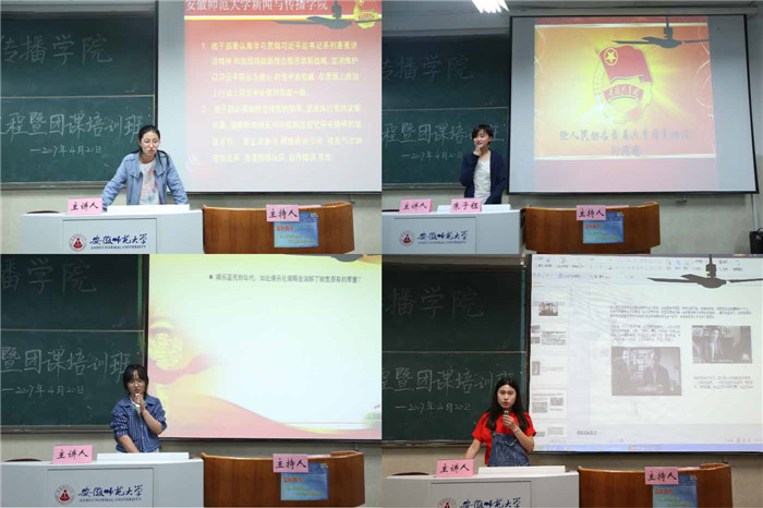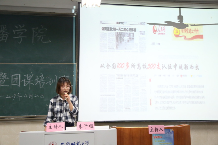 本次团干培训班的第二讲以PPT汇报和理论学习结合的形式进行,首先由优秀党员代表吴利亚和朱子钰依次上台进行汇报。吴利亚以“读懂你的大学”为主题,从“解惑”、“探索”、“提升”、“反思”这四个方面介绍了他的大学生活,用“做本分的读书人”、“做精业的传媒人”、“做奉献的学工人”、“做执着的公益人”这四个“做”概括了他对自我的要求。他说,要做到“立身以立学为先,立学以读书为本”,做有内涵有学问的大学生。而朱子钰作为13级文管班班长、院学生会主席、新媒体研究协会会长、微商博物馆的志愿讲解者,则从自己的学习生活、社团工作、实习经历等方面分享了她与信仰的故事,并结合自己在湖南广播电视台的实习经历告诉大家信仰的重要性。