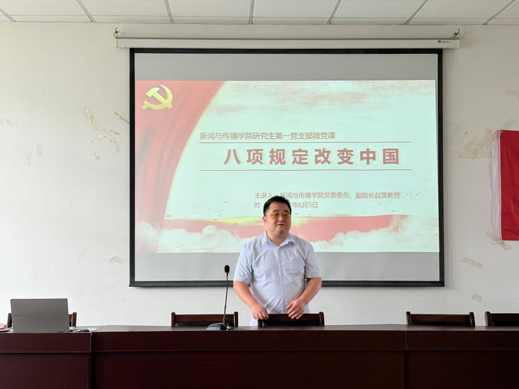 紧接着,赵昊为在场党员开展了“八项规定改变中国”主题微党课。赵昊从政治层面、经济层面、社会层面、文化层面、国家治理层面对八项规定的要求和成效进行了全面解读,并督促在场全体党员认真学习,定期进行自查,严格约束自身。