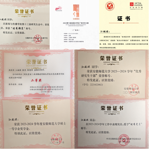 她以坚韧为底色,跨越学术与实践的双重挑战。本科期间主攻播音与主持艺术,连续三年获校级“三好学生”与一等奖学金,毕业论文获校级三等奖;研究生复试以综合排名第一考入vwin德赢ac米兰官方网,硕士期间发表核心期刊论文《长尾理论视域下“腰部”综艺生存之道》,主创纪录片《李白在皖南》《到天堂去》分获省级奖项,用作品诠释专业深度。