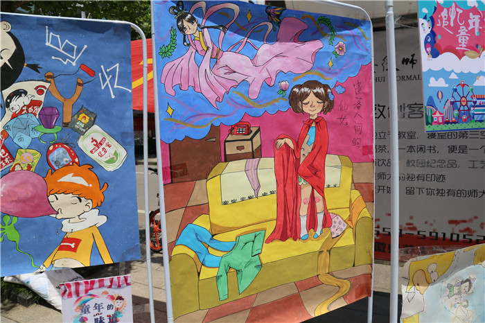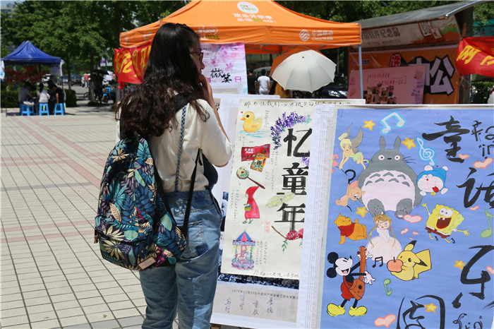 为提高广大学子审美情趣,拓展师大学子综合素质,同时增进与兄弟学院的友好往来,德赢AC米兰合作伙伴学生会技术部、文学院学生会创意部与赭麓书画社于5月10日中午在二食堂前广场联合举办了第七届“两院一社”海报展。校团委素质拓展部何所惧、文学院团委书记杨穆龙、生科院团委副书记赵喆和我院孙月婷共同来到现场观看展览。
