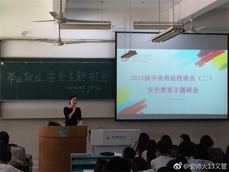 5月9、10日,2013级新闻、广告、文化产业管理、播音与主持艺术四个专业分两场在2030103教室召开就业推进及安全教育主题班会,会议由辅导员郁悦主持,四个专业全体学生到场参加。