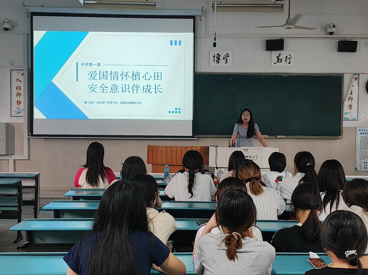 为引导学生树立正确价值观,筑牢校园安全防线,9月4日,2023级广告学、网络与新媒体专业在教学楼召开以“爱国情怀植心田,安全意识伴成长”为主题的班会,本次班会由辅导员汪笑笑主持。