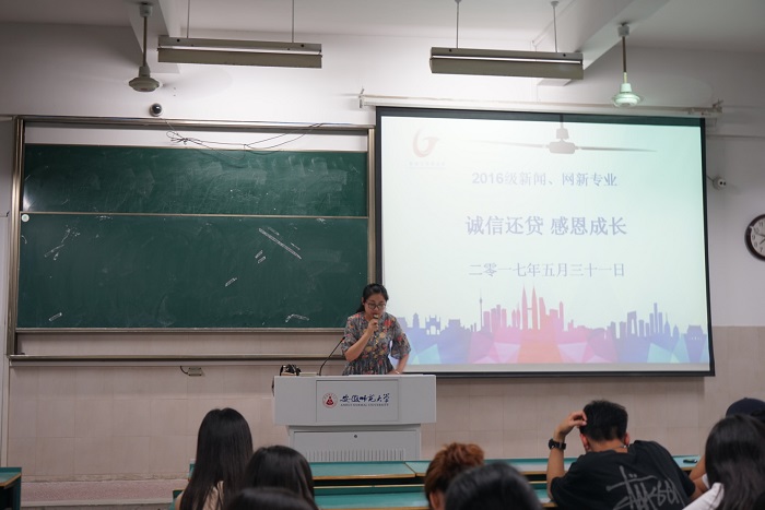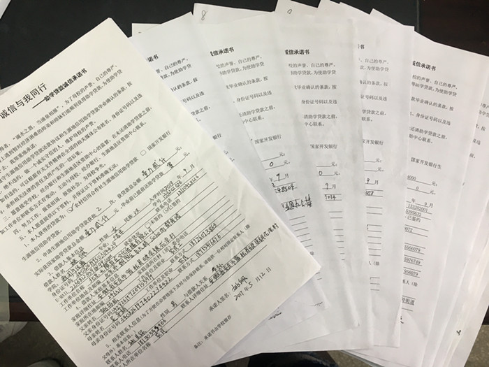 为了将诚信和感恩意识内化于心外化于行,唤醒学生的自我教育和自我完善意识,把学生培养成一名具有讲诚信、知感恩、树自强的高素质大学生,塑造优良的班风、学风。我院各班级内部开展诚信主题班会,不仅仅把落脚点放在诚信还贷上,更是在“诚信立人”上。临近期末考试,班会从诚信考试入手,讲述诚信考试的重要性,提高同学们的诚信意识,认识非诚信考试的危害。2017届毕业的班级,由办理助学贷款的学生共同填写了助学贷款诚信承诺书,承诺在规定时间内做好还款工作。