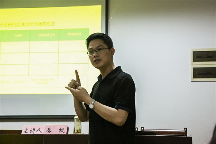 秦枫首先从社会调查到底是什么讲起。“要了解情况,唯一的方法就是向社会作调查。没有眼睛向下的兴趣和决心,是一辈子也不会真正懂得中国的事情的。”从社会调查的概念到社会研究方法与社会调查方法,再谈到社会调查的作用,秦枫善于用现实事例来解释理论问题,生动有趣、由浅言深。谈到选题的来源时,他指出:“我们在选择选题时,要和社会现实、民生还有热点结合起来。”在选择选题时,必须研以致用。预期的研究成果必须有价值,必须要有合适的难度。