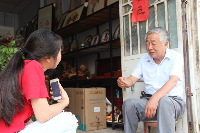 今天我们重返钟馗街,拜访灵璧钟馗画名家——尹友杰大师。尹友杰老师虽然已经71岁,但却是白发红颜,简单的衬衫衬出他踏实进行艺术创作的生活方式。尹老师钟馗画的第三代传人,他的儿孙也是当地很有名气的钟馗画师,所以说是第五代了。我们在他的画室门口进行了采访。在采访过程中,尹老师有问必答,为人率真,他说他除了文化大革命时隔了十年没有画钟馗,一直以来都坚持作画,并注重对传统画法的传承,通过他的言传身教,他们家的钟馗画事业一代代传了下来,是家庭传承的典型。尹友杰老师说:“画钟馗,要突出的就是他的眼睛,要画出那种无论你从什么方向看,他的眼睛都是瞪着你的感觉,这样才能突出钟馗的精气神来。”对于钟馗画的保护方面,尹老师认为:“我们传承的是最传统的东西,我们家几代画钟馗都遵循最初的风格,这样才能不失本味与民俗,将真正的灵璧钟馗画传下去,传承就是最好的保护。”他还提及每年都有调研文化的大学生团队来到这里了解灵璧钟馗画,他很欣赏这样的活动,这也是让年轻人参与传统文化保护的好方式,钟馗画在年轻人当中流行开来,它才能更加熠熠生辉。