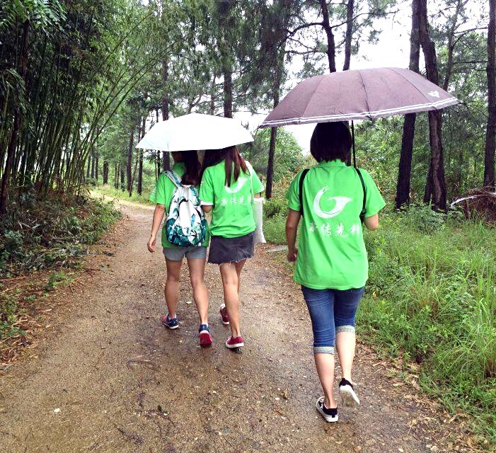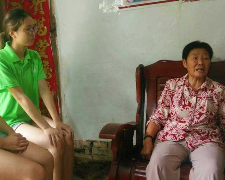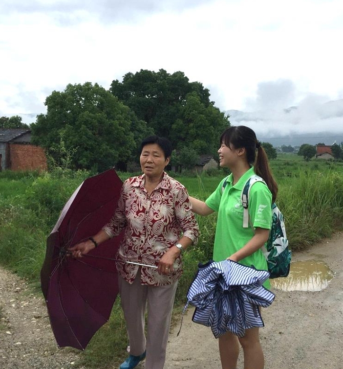 大雨磅礴,一路辗转颠簸。7月1日下午,队员们从8路公交转到205路,步行半小时后来到了吴云芳老人的村子——范岗镇高岗村。乡间小路错综复杂,队员们一路打听摸索,才算是与前来迎接的吴奶奶碰了面。