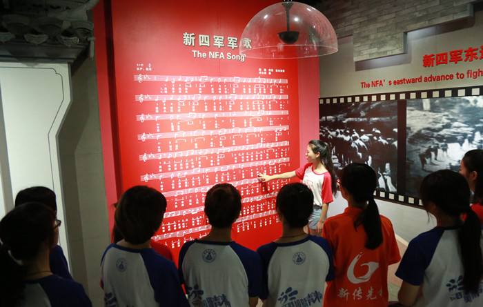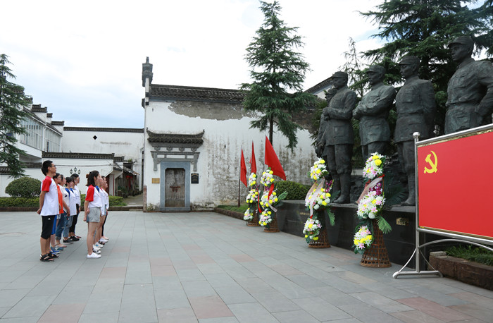天朗气清,晴空万里。队员们深入徽州山野之间,走过承载历史和文化记忆的洪桥,具有浓郁徽派建筑风格的军部旧址映入眼帘。走过两旁墙壁上印有湘、鄂、赣、闽、浙、皖、鄂、豫八省简称的大道,江泽民同志题写的“铁的新四军”五个红色大字把队员们迎进了军部旧址主展厅。岩寺集结、誓师东进、军民情深、铁军传承,每个部分的浮雕、雕塑、文图、锈迹斑斑的铁枪……把队员们带回了那段令人震撼的峥嵘岁月。