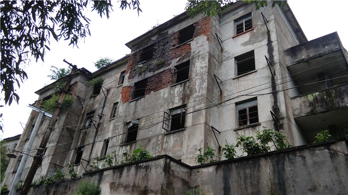 图片说明:燎原厂在三线时期的职工宿舍,在新厂外,属于新厂的老板。但由于对工厂利用价值不大,被废弃在原处。脱落的墙皮,生锈的水管,残破不堪的玻璃,歪歪斜斜的门框,房间里弥漫着潮湿的味道,楼上偶尔几间宿舍被当地村民用来存放木材。