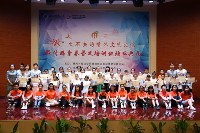 下午3点,汇演正式开始。文艺汇演由两个团队的孩子们用心演绎的歌曲串烧节目《最好的未来》和《重返十七岁》拉开序幕。朗诵节目《殷殷关怀暖徽州》 饱含深情;舞蹈《大王叫我来巡山》展现了孩子们的活力四射。作品展示环节,孩子们展示了在手工课上的风筝、扇子和剪纸等作品。节目《绕口令大PK》使大家领略了语言的魅力;话剧《从现在开始》则带大家走进了孩子们的“动物王国”。随后,两队分别播放了支教视频,视频中记录了传媒素养普及培训班中点点滴滴的动人瞬间以及任课老师对孩子们的寄语。教师朗诵《遇见徽州遇见你》讲述了教师们用行动践行生命的意义。最后,两队分别带来合唱歌曲《那些花儿》和《爱,因为在心中》,老师与孩子们手牵着手,紧紧相依,留下动情的眼泪,将气氛推向高潮。节目结束后,暑期社会实践团队的指导老师马星宇和张雁分别发表讲话,并给在传媒养普及培训班顺利毕业的孩子们颁发结业证书,最后合影留念。
