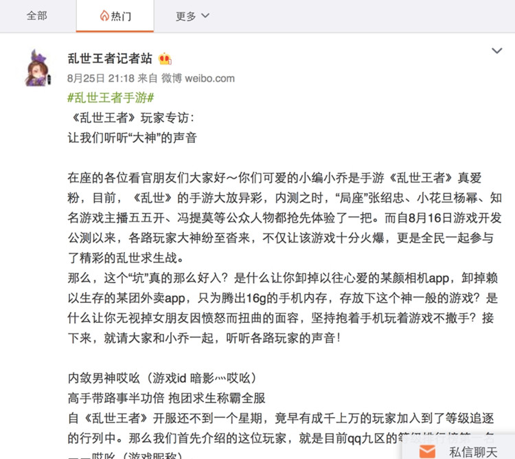 程欣瑶同学暑假参加了“独出心裁——QQ炫舞服装设计大赛”,获得了全国第四名的好成绩,有机会进入腾讯游戏负责“御龙在天”官博官微运营、“乱世王者”手游文稿编写等工作。这是一份线上实习,大家在一个工作群里,完成发布的各项工作,大家互相之间以网名代称,以完成任务量计费。在这份实习里她需要独自采访游戏大神写作攻略,独自运营微博微信独立作图,每天都要有产出,既对人际交往能力提出了要求,又锻炼了传统媒体中的写作基本功,提高了新媒体运营技能,在短时间内获得了很大的成长。