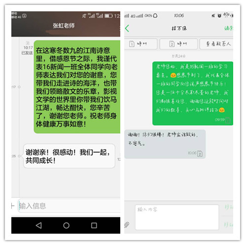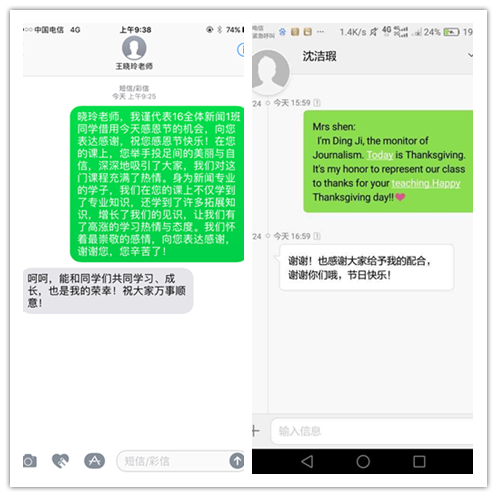 短信字字报师恩,班级板报颂恩情。11月24日,感恩节的这一天,同学们都在向学委请求老师们的手机号码,说想给老师们发祝福的短信。“感谢三个月以来您的倾囊相授与耐心教导!”“希望你们做事做人都要尽自己最大努力,你们的成长是老师最大的快乐!”当老师们收到声声感谢并回以温情的答复时,这场初雪也将熔化了。此外,16新闻班还出了一期以感恩为主题的黑板报。尽管时间匆忙,但每个参与人员都尽心尽力,付出许多努力,晚自习、晚自习结束后一小时、空闲时间,天气很冷,大家的手冻得通红却没有放弃,希望借此表达“恩欲报,报恩长”的观念。