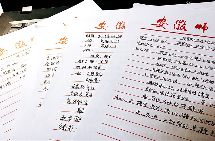 26栋306寝室在会议记录上写道:“用心交流,互相帮助是寝室良好关系的保证。”只有寝室环境在变好、寝室氛围在变好,我们才有理由相信,寝室这个小家,会成为学生课堂之外一个温馨的栖息地。