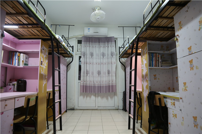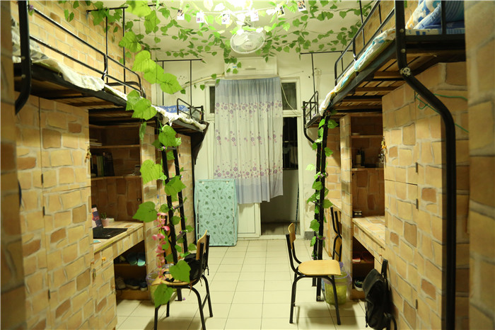 本次比赛中涌现了不少脑洞大开的寝室设计,女生304寝室以田园风格为主题,将绿色植物铺满整个天花板,同时用装饰的废料拼出了寝室号和简洁图案,充分践行着“绿色环保”的生活理念。她们在寝室上空悬挂一张张生活趣照,极富新意。501寝室以粉、蓝、灰为主基调,配合黑色的卡通贴画,简约中不失可爱。地面是仿地板式贴纸与白色地毯,配上精致小黑桌,家的感觉扑面而来。