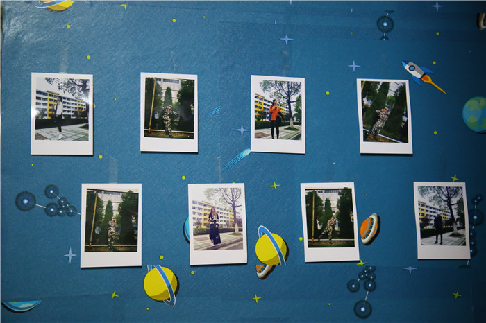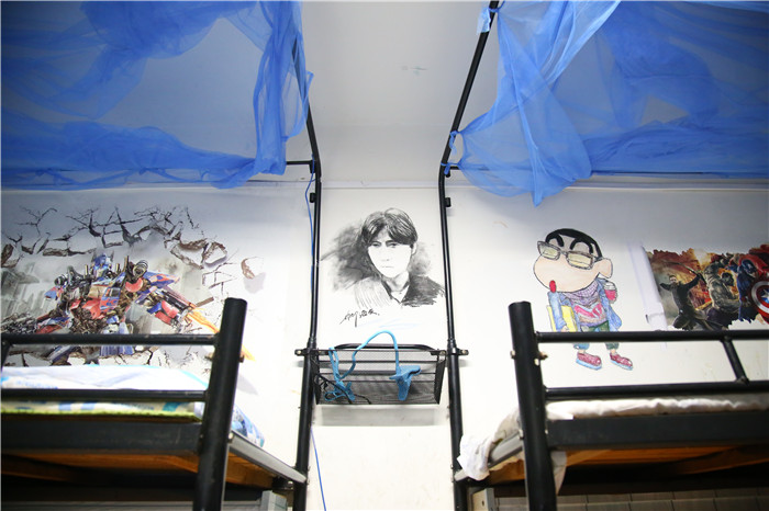 除此之外,另有寝室将吊椅、盆栽等绿植点缀其中,清新自然,令人眼前一亮的是一幅幅书画作品,大写的“拼搏”二字覆盖了整面墙壁,解说的同学笑着说: “这幅字我们贴在镜子对面的墙,就是为了每天早上洗漱的时候能看见,提醒自己要拼搏。”