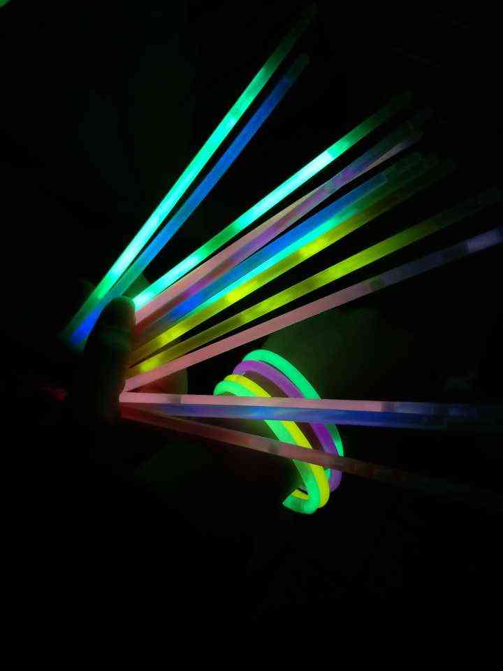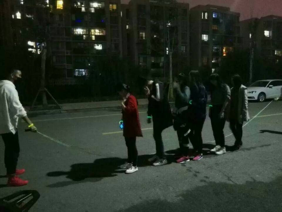 当晚六点钟,同学们自由组队,每队六人,戴着荧光手环一起出发。过程中他们经历了四个障碍点的趣味活动,有踩气球,猜词,六人跳绳等游戏,每通过一关他们都会得到一定数量的小红花贴纸。