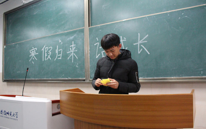 活动伊始,陈建军同学介绍了这次座谈会的开展形式及意义。同学们在便利贴上先用五个字总结寒假最有意义或影响最深刻的一件事。接着,由主持人随机抽取便利贴,并宣读内容,若大家一致认为内容有趣或有意以,便由被选中的便利贴的主人和同学们分享自己的故事。