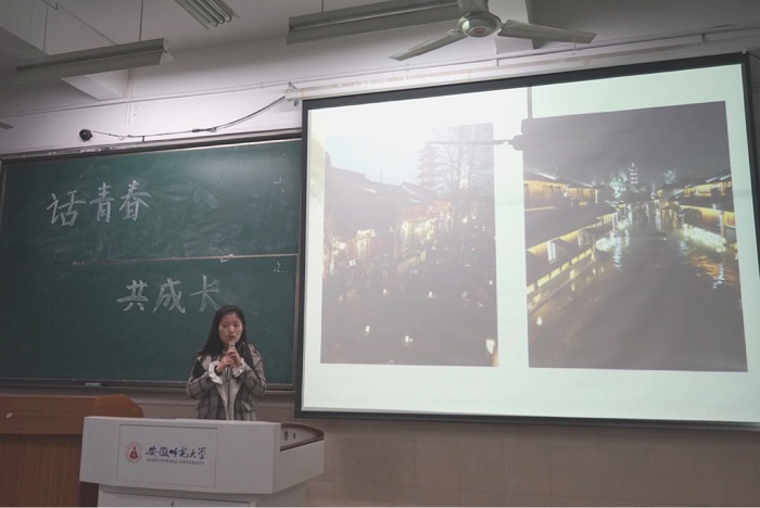 接着,新闻班杨君宜、钱浩及新同学张甜甜与网新班胡啸上台展示。钱浩从假期里发生的一些新闻讲起,再回到自己的生活,以“苟生苟死苟残喘,亦福亦祸亦趋之;利校利院利班级,泽师泽友泽新传”作结,会场气氛又达高潮;胡啸则是在一个寒假里读完了十二本专业书,羡煞了在座的同学,他说:“著作比较艰涩以至于发现自己不能和作者成功对话,挣扎谈不上,在认为自己欠火候之后更加有动力读书,而不是放弃。”班会举行到这里,正是如火如荼时,又有三位同学自愿上台分享假期生活,他们分别是来自新闻班的张吴越、吴岳茂和杨越晴,给大家带来美食与美景的大餐。