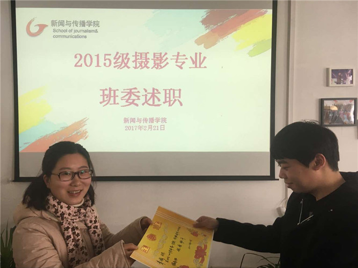2月21日上午,在院学生会办公室,2015级摄影班举办班委述职报告会,本届班委会面向全班同学汇报履职情况,接受学生代表的民主评议,辅导员张虹全程参加了述职汇报会。
