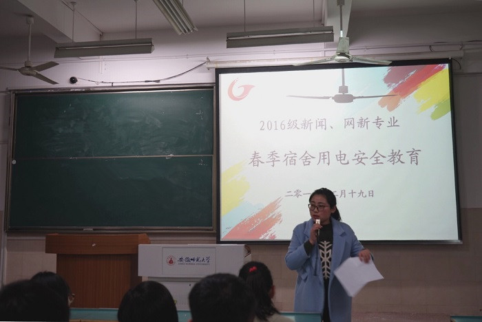 主题班会吹响安全集结号。为提高同学们的自我防范意识,保护同学们的生命财产安全,2月22日晚七点,2016级新闻与网络新媒体两个专业共同召开春季安全教育主题班会,2016级新闻、网新全体同学参加了班会,班会由辅导员张雁主持。主题班会中,辅导员张雁向同学们传达了学院安全教育专题报告会的内容,重点从校园人身安全问题、寝室安全问题、财产安全问题、火灾防范问题等方面对同学们展开教育。其中对于严禁使用违规电器和用电不当的安全事件再三叮咛,希望同学们加强注意,严禁使用违规电器,规范用电,避免造成火灾等安全事故,并带领大家观看了因用电不当导致高校火灾事故的视频。对于财产安全问题,张雁也做了再三强调,希望同学能够保管好自己的个人财产,重视贵重物品的存放,提高警惕性,防止上当受骗以及偷窃等事故等的发生。张雁还提出,在班级的日常管理中,需要班委们的切实负责,定期开展宿舍的查寝工作,检查违规电器、不良用电行为的存在情况。