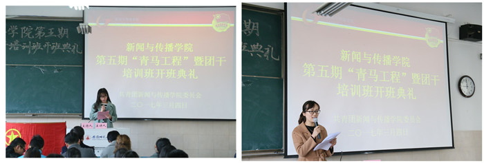 为培养卓越新闻人才和青年马克思主义者,本期培训班共招募93名团员青年,主要来自院学生会、社团和班级团支部中表现突出的学生干部。 伴随着嘹亮的团歌,第五期“青马工程”暨团干培训班正式开班。2015级新闻学专业的宣智丽作为学员代表发言,她从自身在院学生会的成长故事讲起,结合她新闻学子的学习经历,讲述她对马克思主义新闻观的深刻体会,同时表示作为‘青马工程’暨团干培训班的一员,会更加珍惜这样的学习机会,静下心来刻苦学习,不断提高自己的理论水平和工作能力,做有理想有追求的大学生,做有担当有作为的大学生,做有品质有修养的大学生。