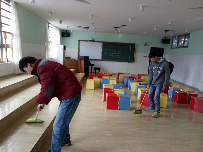 负责安师大附小服务工作的网新专业班的同学们,也在老师的带领下去熟悉和掌握自己的工作岗位主要是清扫教室、整理杂物和清理灰尘等。相较于同学们生活的校园而言,附小对他们是陌生的。当他们第一次踏入附小的校园时没有同学们和老师们的夹道欢迎和鲜花掌声,但却有附小孩子们的朗朗读书声萦绕耳边。孩子是祖国和民族的未来,同时孩子也是拥有无限可能的未来。所以这读书声胜过一切的掌声和欢呼声,也是对网新班同学们辛勤工作的最大肯定和赞美。