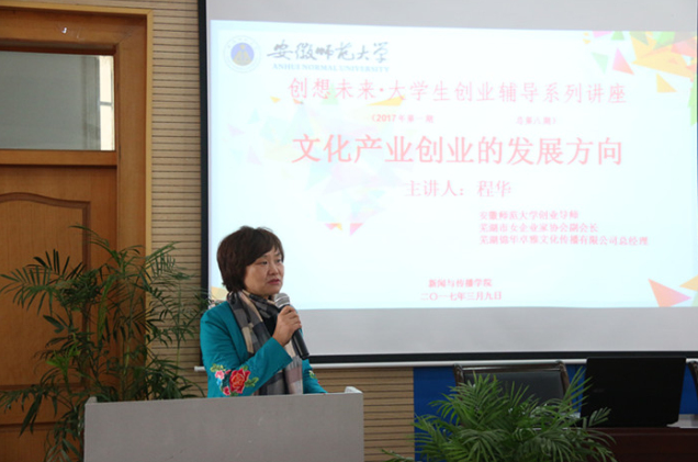 为响应国家“大众创业、万众创新”号召,落实推进大学生创新创业教育和就业创业扶持工作的具体举措,引导学生积极投身创业实践。3月9日下午,创享未来·大学生创业辅导系列讲座之“文化产业创业的发展方向”在花津校区会议中心第三报告厅开讲。讲座由学生处(就业指导中心)主办,德赢AC米兰合作伙伴、美术学院、历社学院、国旅学院、环工学院、体育学院共同承办。本期讲座特别邀请到vwin德赢ac米兰官方网创业导师、芜湖市女企业家协会副会长、芜湖锦华卓雅文化传播有限公司总经理程华担任主讲人,由德赢AC米兰合作伙伴团委副书记孙月婷主持。来自六个学院的近两百名本科生共同聆听了本期讲座。