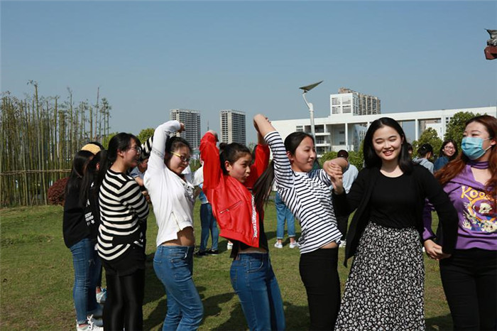 带领大家完成这次体验式教育的“晴天”老师来自15级休闲体育专业,他是“国家中级体验式培训师”、“国家中级营地教育师”。4月15日下午两时四十分体验之旅正式开始。你一分钟可以击掌多少次?这个问题如果没有尝试过应该很难回答吧,15新闻的同学们你一言我一语的,80,100,150,200……大家集体尝试十秒钟之后,最快的同学刘小容同学竟然能够达到86个,“晴天”老师说,“一分钟有六个十秒,86×6=516,减去过程中因为疲劳而产生的损失50个,所以几乎可以击掌450 下左右。”一个简单的小游戏“潜力击掌”让大家若有所思,正如这个游戏的理论来源“冰山理论”一样:个人的“自我”就像一座冰山一样,我们能看到的只是表面很少的一部分--行为,而更大一部分的内在世界却藏在更深层次,不为人所见。所以我们待挖掘的潜力其实是极大的。