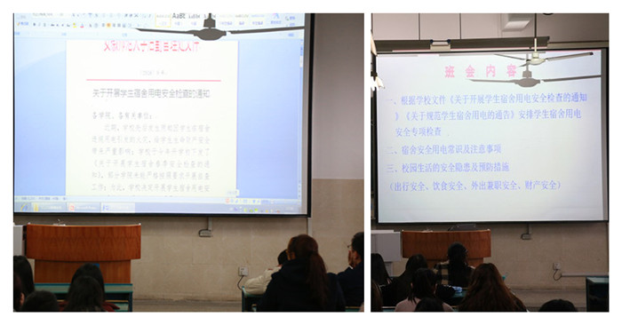 会上,孙老师传达了学校关于安排学生宿舍用电安全专项检查工作的必要性,并带领同学们逐条学习了学校发布的《关于开展学生宿舍用电安全检查的通知》、《关于规范学生宿舍用电的通告》等文件;随后她还就宿舍安全用电常识及注意事项做了重点提醒,列举了随意使用违禁电器、使用明火、私拉电线等安全隐患,并对电源插座的合理使用等方面进行提醒。