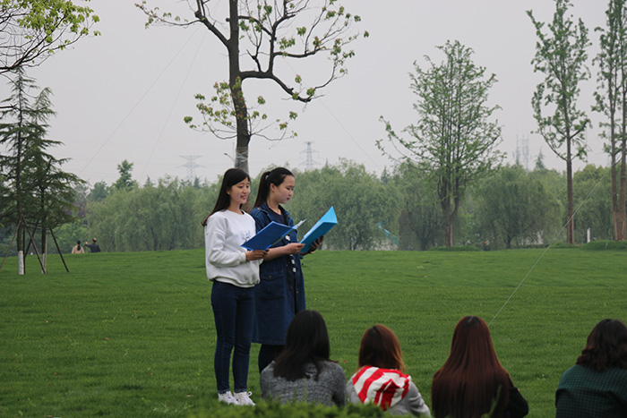 4月24日下午3点,在2014级辅导员老师孙月婷的带领下,来自新闻、广告、摄影、动画四专业共40余名班委同学同马克思主义新闻观学习社的骨干社员们于师大校园中央景观绿地展开了春韵诗歌诵读会。2014级新闻学专业的何修豪以一首评弹曲《无锡景》将全体师生从平日烦嚣的生活带进了丝竹悦耳的读书雅韵中。“我不是归人,是个过客”2014级广告学的陈苏洁和姚程阳将一袭青布长衫牵着倦马的文人形象细细刻画,哒哒的马蹄是乡愁还是情思?个中情谊自然只能是同学们自己把玩体味。才女林徽因一直被大家津津乐道,2014级新闻学专业的陈晓煜、罗凡带来的一首《你是人间四月天》十分应景。“你是爱、是暖、是希望,你是人间的四月天。”这首送给孩子的诗歌,在静谧的午后、宽阔如茵的草坪上朗诵起来,倒也平添几分阳光与活力。