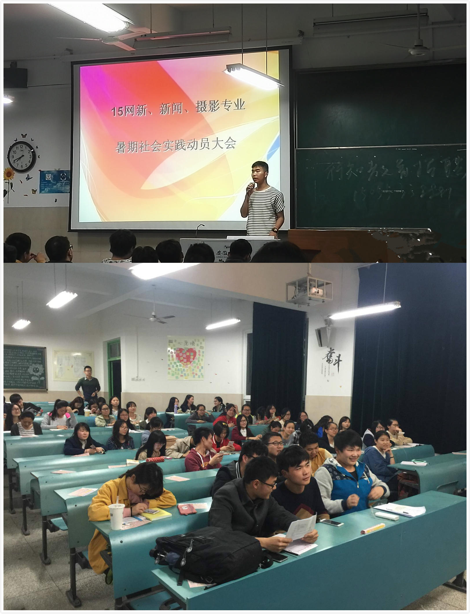 响应着党团的号召,高举青春的旗帜,我校一年一度的大学生暑期社会实践活动正在积极紧张的筹备之中。为了更好地促进学生综合发展,提升学子综合素质,15级网络与新媒体、新闻与摄影三个专业于4月28日晚,在2050304教室召开暑期社会实践动员大会。