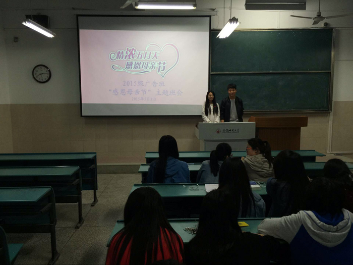 广告学专业从五个方面展开活动。活动的开场,主持人为大家介绍了母亲节的由来,并播放了首赞美母亲的歌曲:《世上只有妈妈好》与《听妈妈的话》,熟悉的旋律、动人的歌词让同学们的湿了眼眶。紧接着的是主持人邀请了两位同学上台朗诵赞美母亲的诗歌,同学声情并茂的朗诵赢得了阵阵掌声。活动进入高潮时,班长将准备好的留言卡发放到每位同学手里,大家都认真地写了对母亲的祝福。语句虽然简短,但是体现了真挚的感恩之心。最后主大家一起欣赏了影片《和声》,电影中一系列体现母爱的故事,让同学们感受到母亲养育之恩的伟大。