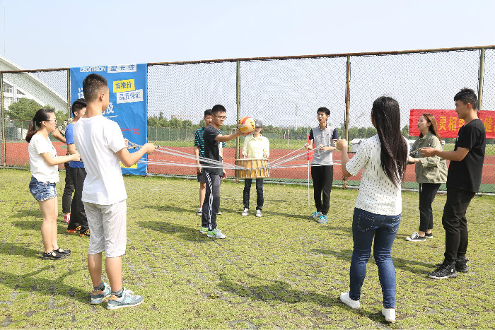 活动中,6个队伍被划分为两大队,分别进行了“极速60秒”和“齐鼓飞扬”两场游戏。“极速60秒”考验同学们的眼力及思维应变能力,游戏要求每支队伍中仅有一人能够进入指定圈内抓牌,其余人留在圈外,在规定的时间内按照数字从小到大顺序将30张牌交给训练老师,用时最少队伍获胜。而“齐鼓飞扬”又名“齐心鼓”,允许每支队伍有20分钟的准备练习时间和三次挑战机会,最终成绩取三次挑战中的最佳成绩。游戏规则简单,实际操作却难,同学们在“极速60秒”的游戏中,被30张五花八门的纸牌绕得头晕脑转,摸不清方向。15网新的邓诗琪说:“这个游戏太难了,我们无法在60秒的时间内将30张牌上图案所表示的数字全部猜出来,更不用说按顺序上交纸牌了,只能一轮接一轮的重来。”而在“齐鼓飞扬”环节,同学们则遇到了更多的难题。由于每个鼓边的绳子长短不一,个别队伍的鼓面不平,同学们的力度不同,许多队伍的排球在还未碰到鼓面时就已落地,很少能够颠球突破两位数。尽管问题多多,困难重重,每支队伍都顺利出色地完成了游戏。当队员们还沉浸在游戏的欢乐中时,主训员提议再玩一个小游戏,名叫“金钱‘抱’”,要求所有队伍围成一个大圈,女生为1元,男生为5角,同学依照指定价格自由组合。“80!”所有人抱成一团,开心地看着彼此。“希望你们能记住今天的这个拥抱,记住在场的所有伙伴,记住团队与协作精神!”主训员语毕,一阵掌声响起,此次的素质拓展训练也落下了帷幕。