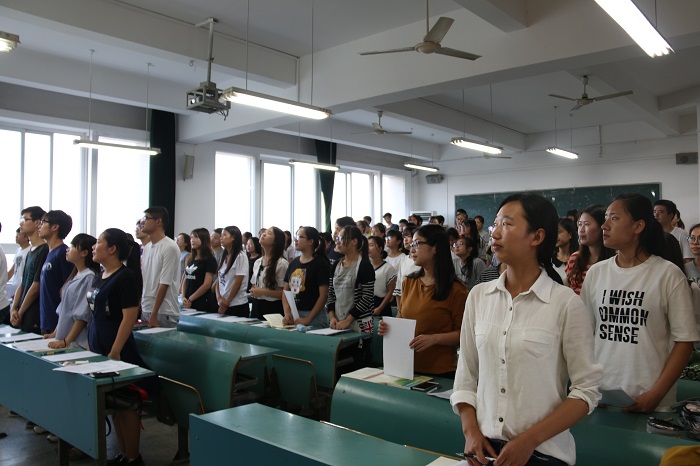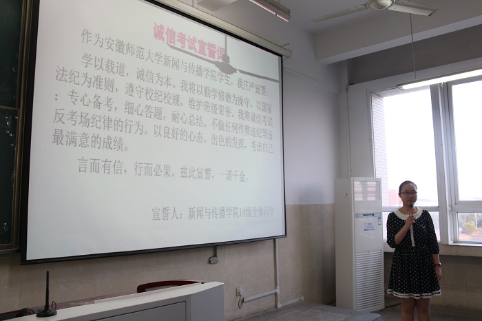 随后,全体学生在各班班长的带领下集体宣誓,在《考试诚信承诺书》上签字,承诺将以大学生道德规范为操守,自觉遵守考场纪律,诚信做人、诚信考试。诚信考试的宣誓词朗朗字句有力,传递着每位同学为梦想而战、为零违纪而战的决心。