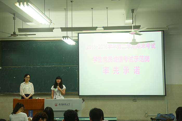 为积极响应学院“两学一做当先锋,部校共建创一流”学习教育,发挥学生党员、入学积极分子的先锋模范带头作用,以点带面营造风清气正的考试氛围。2014级新闻、广告、摄影、动画专业的学生党员、入学积极分子率先在学院内组织“学生党员诚信考试示范岗”活动,在考试期间认真做好考试提醒、座位排序和考场清理等勤务工作,真正发挥党员模范先锋的表率作用。会上,学生党员和入学积极分子代表纷纷走上讲台,率先承诺,积极表达对于诚信考试中如何发挥学生党员率先模范和服务同学的思考、观点和看法。2014级新闻学预备党员何修豪说:“我们要以‘人如傲菊不畏难’的心态直面考试,更要以‘心似兰花一片清’的心态准备考试。”2014级广告学预备党员陈苏洁也表示,作为大学生党员我们要坚决与违反考试纪律说不,要坚守道德红线。大家对日常考试中舞弊行为的质疑,2014级摄影专业预备党员方旭谈到,希望同学们敢于向这些行为说不,尽可能的减少负能量的影响,积极主动地以党员身份去影响身边的同学,多传播正能量,在关键时刻,应该牢记党员身份,坚守信念。2014级广告学预备党员张进文说:“我们要尽最大努力去发挥学生党员的力量,敢于发声,甘于奉献,为学院营造一个良好的学习考试氛围。动员广大党员、积极分子在期末考试中发挥自身的模范作用,不仅要自身学习优秀,更应带动广大同学认真复习,诚信考试,让“创先争优”活动的阵地转战自习室、考场,在学习和考试中发挥党员的模范作用,争当诚信考生,考出优异成绩。