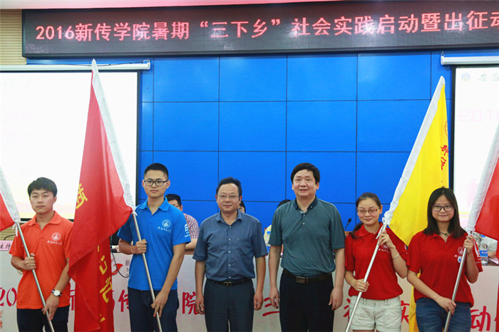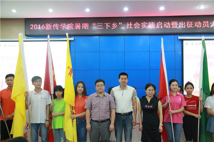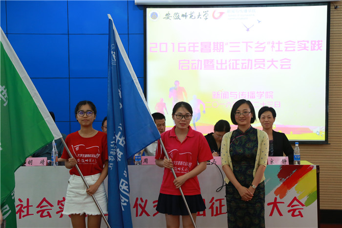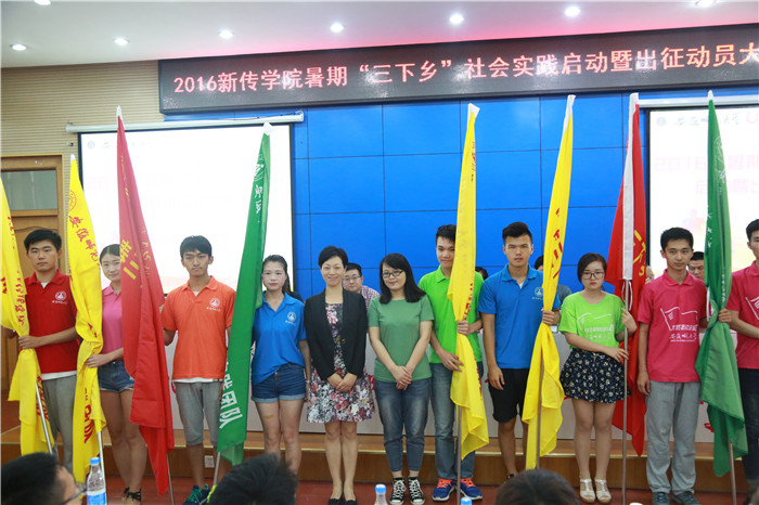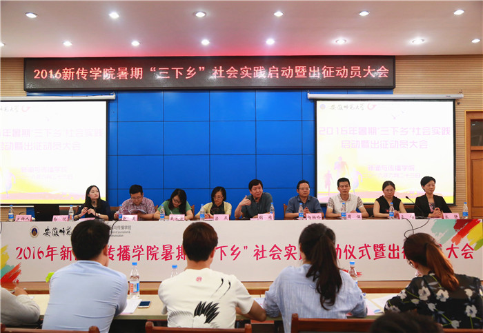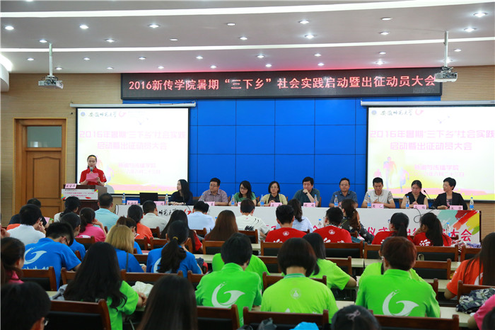 启动仪式在激昂的共青团团歌中拉开了序幕。郁悦首先代表院团委对今年学院推进暑期实践工作的总体情况作出了简要介绍。赵昊宣读了学院2016年大学生暑期“三下乡”社会实践校级、院级重点团队名单。暑期实践思政指导老师戴家芳从思想政治教育的三个课堂切入,指出了社会实践在服务他人、服务社会以及提升自我中的重要作用。真知源于实践,青春居于实践,她就实践的育人功能对在座的所有同学提出了三点要求,即珍惜机会,投身实践;服务社会,彰显价值;严守纪律,确保安全。马梅作为专业指导教师代表进行发言,她结合自身多年教学经验及带队经历,提出暑期实践是第一课堂的延续,是体察国计民生、感受人文情怀的有效途径,是增进友谊、培养团队精神的绝佳方式。“纸上得来终觉浅,绝知此事要躬行”,她鼓励同学们将写稿、采访、摄影、摄像、剪辑、编辑、配音等这些业务环节整合于一体,运用于实践,走进实践,用心投入,讲究方法,学会承担。2014级新闻学专业陈晓煜作为2016“三下乡”志愿者代表,用她从去年暑期实践初体验到2015整装重出发的心得感想,和实践队员分享自己在暑期社会实践中受教育、做贡献、长才干的深刻感触。她谈到暑期实践是大学生活最亮眼的底色,它是一种奋斗的历程、一种拼搏的干劲、一种共同为一个目标挥洒汗水的体验。面对即将出征的暑期实践,她向同学们发起倡议“青春只有一次我们一定会用我们的青春汗水为七月骄阳再添一份绚烂,在盛夏时光去体会一场青春的酣畅淋漓!”。