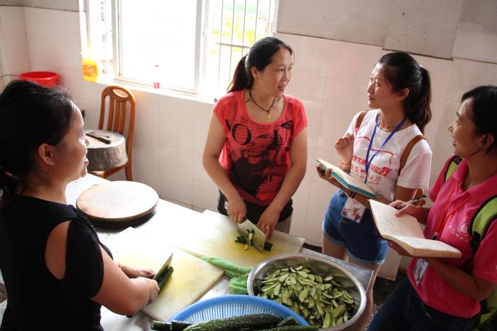 土地是农民的命根,被洪水冲毁了粮食的农民格外想回到自己的家,牵挂着家里的鸡鸭猪。刘美玉和黎世红细心的劝导着这些老人别回家,陪老人们聊天。她们往往在1点钟才会吃上午饭,等过灾民们全部吃完后,她们才会随便吃点。“得要灾民们吃饱,我们不能和他们抢吃的。”黎世红边切菜边向记者说道。