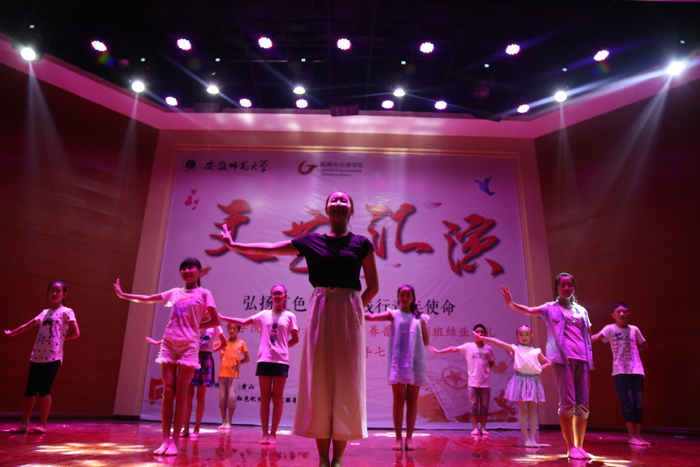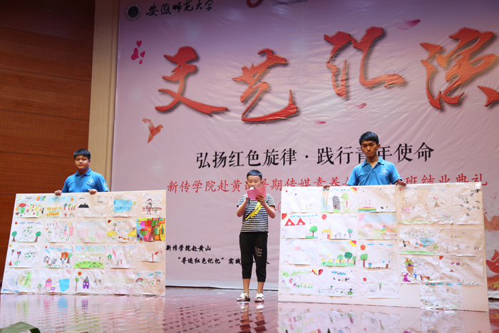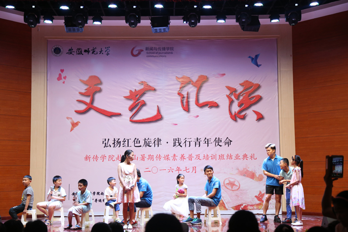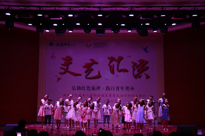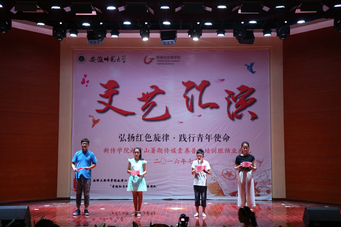经过长达10天的社会实践,本月13日,我院赴黄山“寻迹红色记忆”实践服务团队全部工作进入收尾状态。来自新闻、广告、摄影、播音等专业的各个年级20多位同学顺利完成各项任务,即将结束此次黄山之旅,奔上回程之路。13号下午,传媒素养普及培训班全体师生于徽州区青少年活动中心大礼堂举行主题文艺演出暨培训班结业典礼,观看汇演的领导老师有徽州区青少年活动中心张海云主任、程雪飞老师、团队指导老师陈德洋以及学生和学生家长。