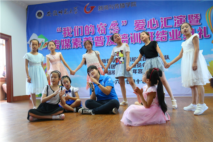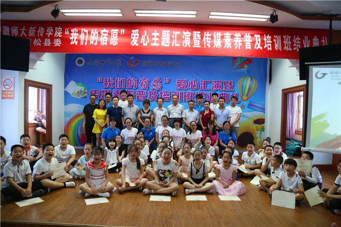 7月17日上午,德赢AC米兰合作伙伴“我们的宿愿”爱心主题汇演暨“传媒素养普及培训班”结业典礼在宿松县城举行,这也标志着为期近10天的传媒素养普及班课程圆满结束。宿松县关工委常务副主任陈宜春、县委组织部副部长朱敏、县总工会主席周学军、县妇联主席唐文洁、县委宣传部副部长、县文联主席江林顺、县文广新局副局长洪云、县委讲师组副组长黄带斌、团县委副书记余玲及县教育局团工委书记梅耐冰等受邀出席,典礼由志愿者郭雅迪以及4名培训班的小朋友主持。