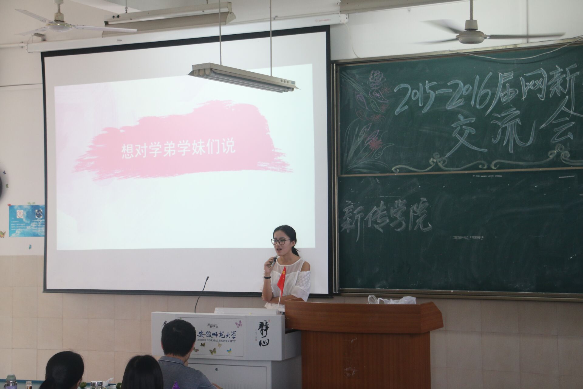 交流会伊始,15级网新高敏展示精心制作的幻灯片和视频,通过这些再现了学长们的学习与生活,同时展现了网新班集体的友爱和专业的魅力。具有温雅气质的15级网新班级心理健康委员徐佳敏学姐一上台便紧紧抓住了同学们的目光,她就当前大学生的心理健康问题发表了独特的见解,并希望新生班级能重视心理健康问题,及时向同学、辅导员老师寻求帮助。随后,15级网新学习委员陈逸雯,专业课排名第二,向大家简述了网络与新媒体专业的学科定位和优势,及ABC3个模块的学分的重要性。接着,15级网新宣传委员汪梦雪,校一等奖获得者,分享了自己如何兼顾学习和学生工作,享受大学生活。最后,在15级网新班长王晨的幽默话语中,交流会的气氛被推向了高潮。王晨分享了他担任班长的心得体会,鼓励16级学弟学妹们积极竞选班级职务,参与班级建设,重视与同学及老师的关系。